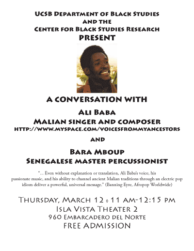 “... Even without explanation or translation, Ali Baba’s voice, his passionate music, and his ability to channel ancient Malian traditions through an electric pop idiom deliver a powerful, universal message.” (Banning Eyre, Afropop Worldwide)