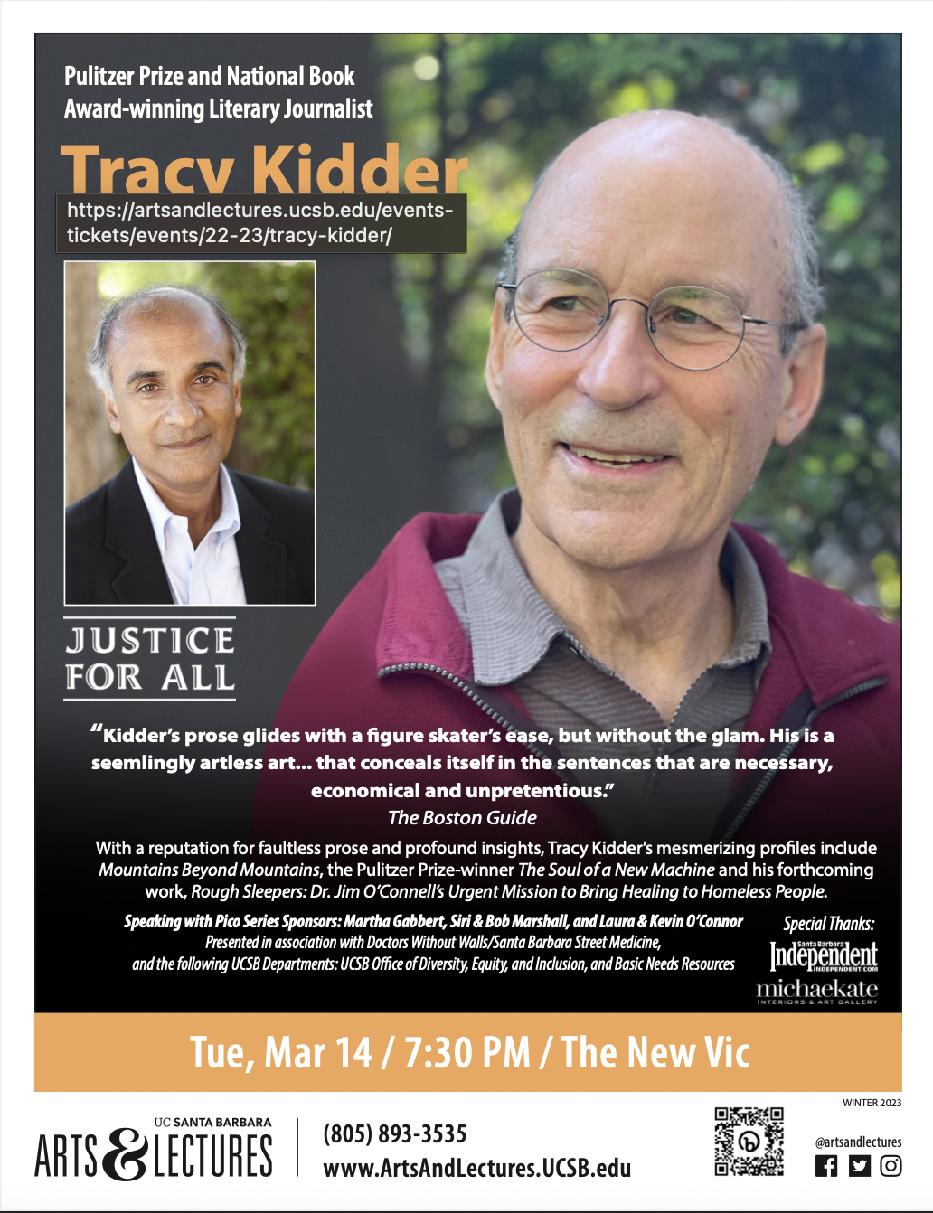 Pulitzer Prize-winner Tracy Kidder stands at the forefront of American letters as a champion of the heroism of everyday life. With a reputation for faultless prose and profound insights, his mesmerizing profiles include Mountains Beyond Mountains, which brought the world’s attention to Dr. Paul Farmer, and the Pulitzer Prize-winner The Soul of a New Machine. In his forthcoming work, Rough Sleepers: Dr. Jim O’Connell’s Urgent Mission to Bring Healing to Homeless People, Kidder continues to amplify the efforts of unique individuals who transcend cynicism and create hope.